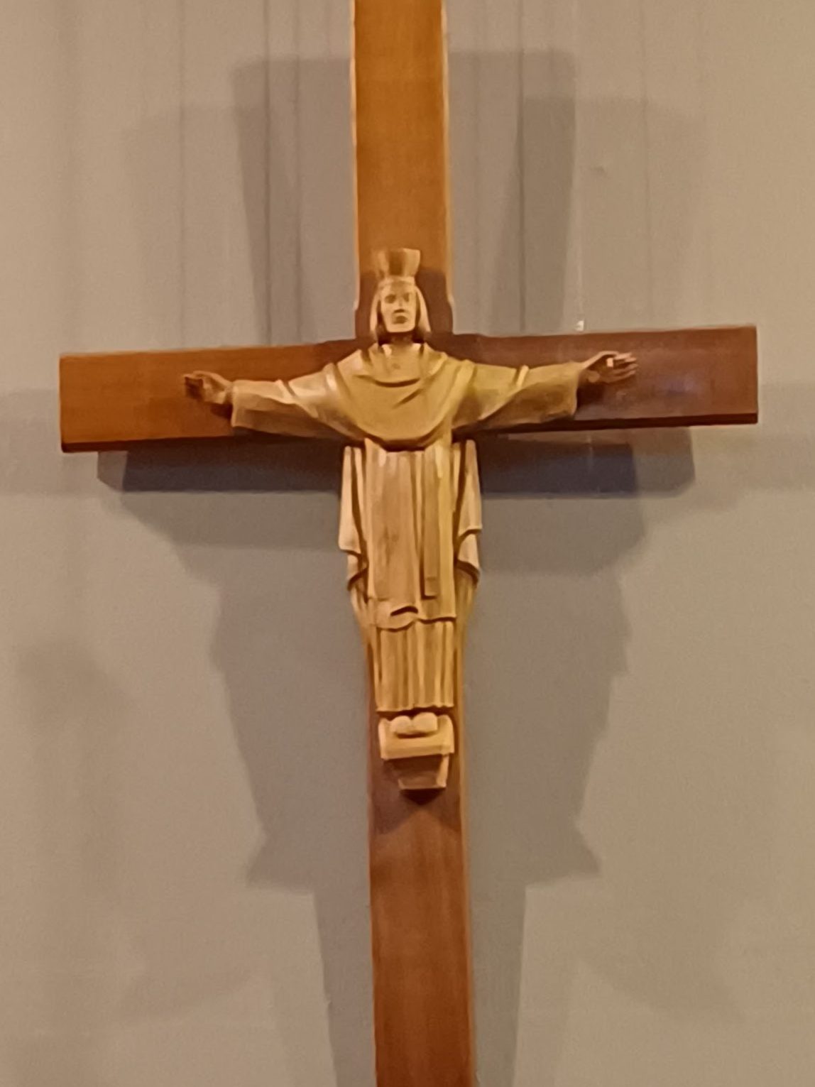 The crucifix that is now located in the Narthex was originally located at the altar. In March of 1970, the present Christus Rex was hung on the “east” wall for Easter. It was hand-carved by wood carvers in Oberammergau, Bavaria, Germany, as a gift from the Morrett family.
